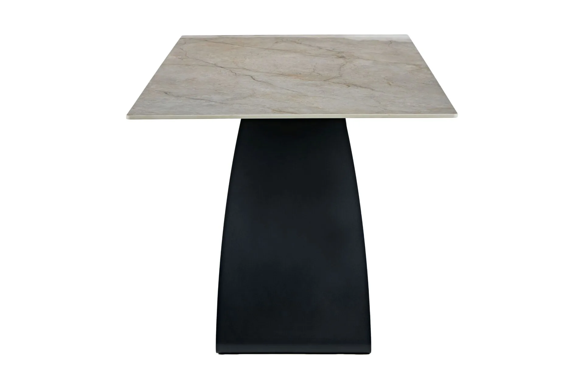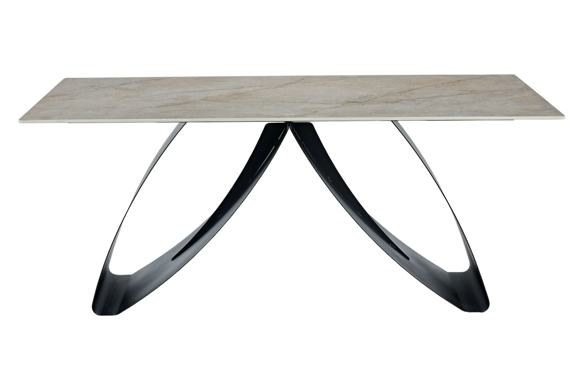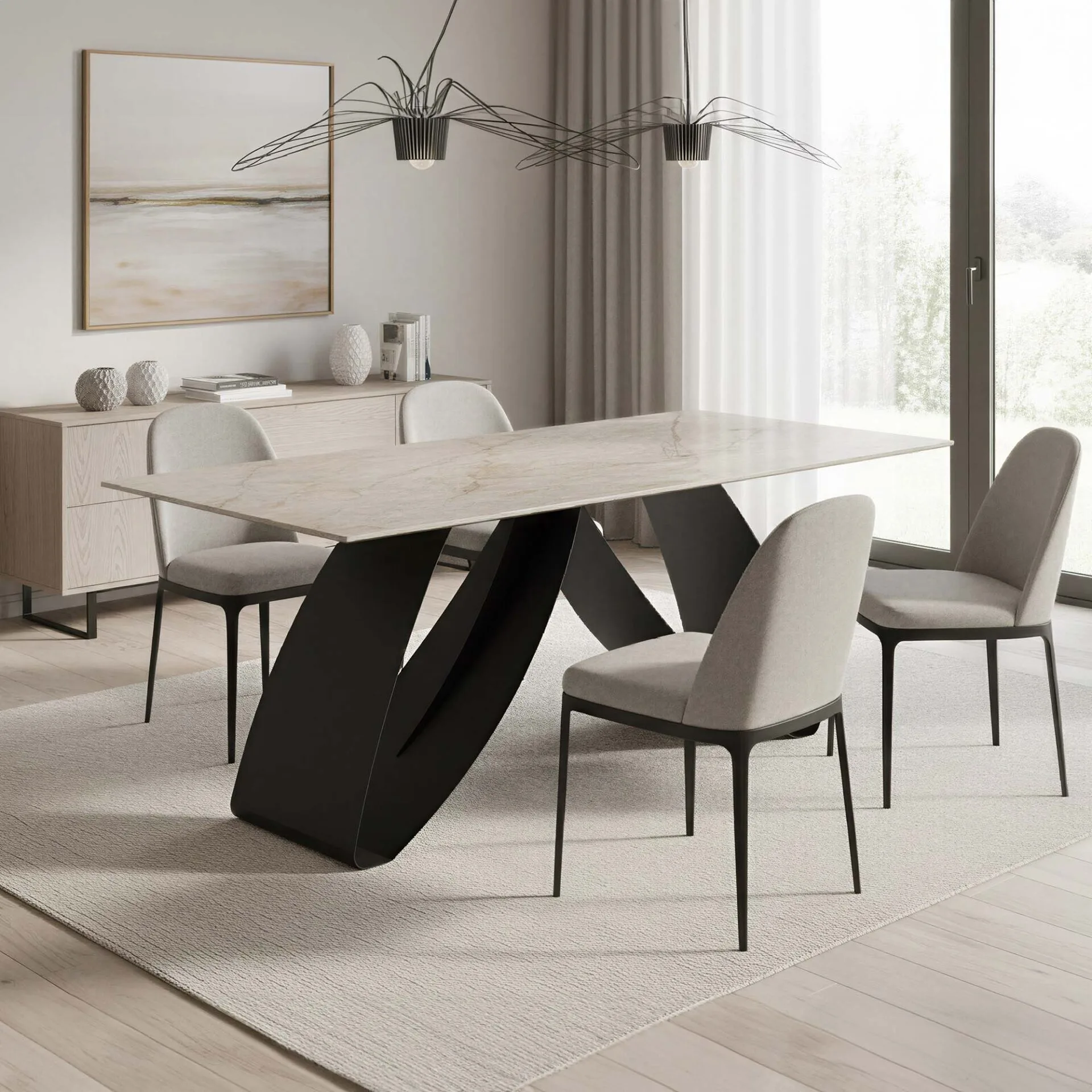 A lábak geometrikus kialakítása vizuális könnyedséget ad, miközben elegáns kontrasztot biztosít a fényes szinterezett kő laphoz, így az étkezőasztal a modern enteriőr stílusos központi eleme lehet.