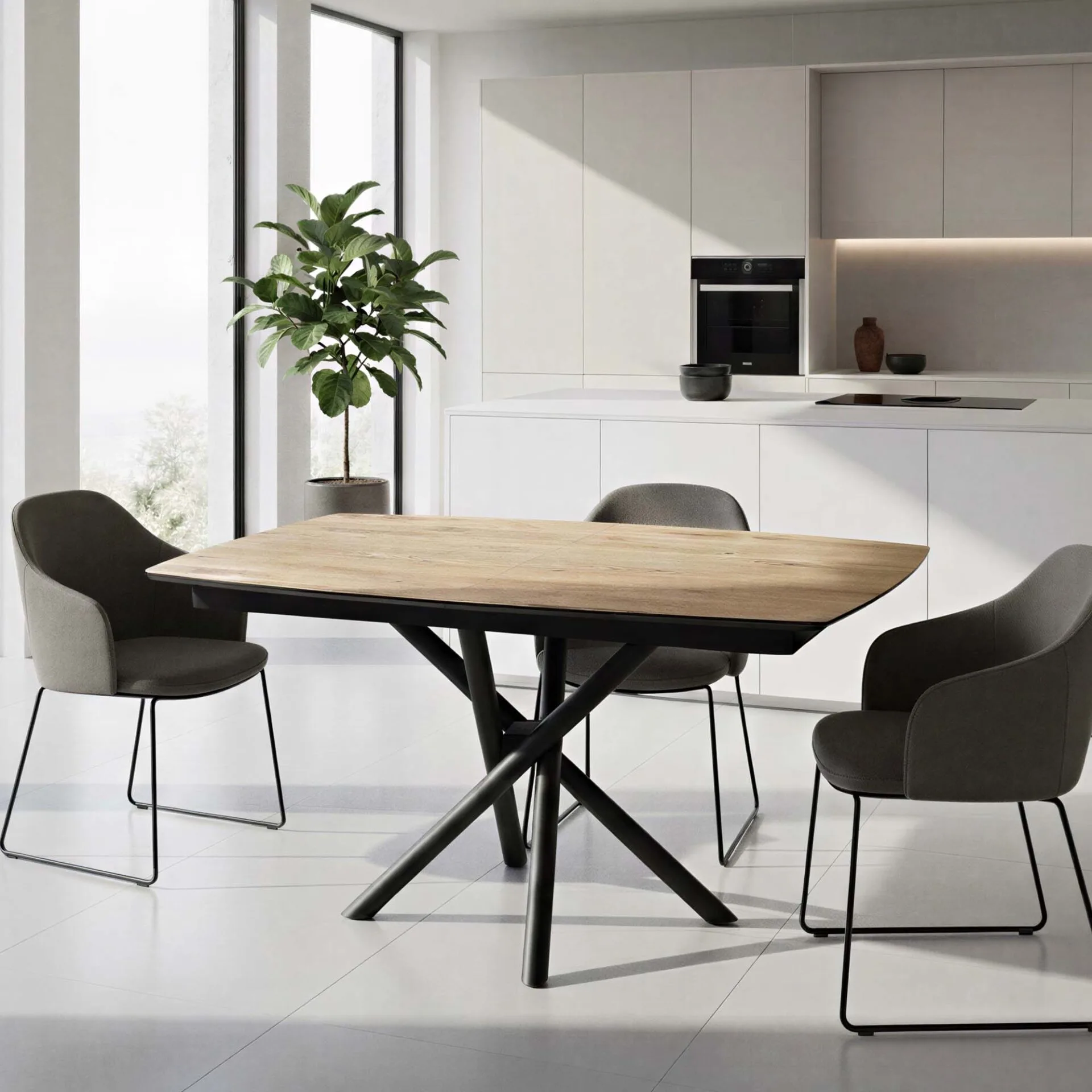 A modern megjelenést tovább erősítik a fekete, fém lábak, amelyek biztosítják az asztal stabilitását és hosszú élettartamát. A masszív fémszerkezet garantálja, hogy az asztal bővített állapotban is stabil, billegésmentes maradjon. A stabil, mégis könnyed lábkialakítás karaktert ad a bútornak, miközben jól harmonizál a Rivoli asztallap természetes árnyalataival.