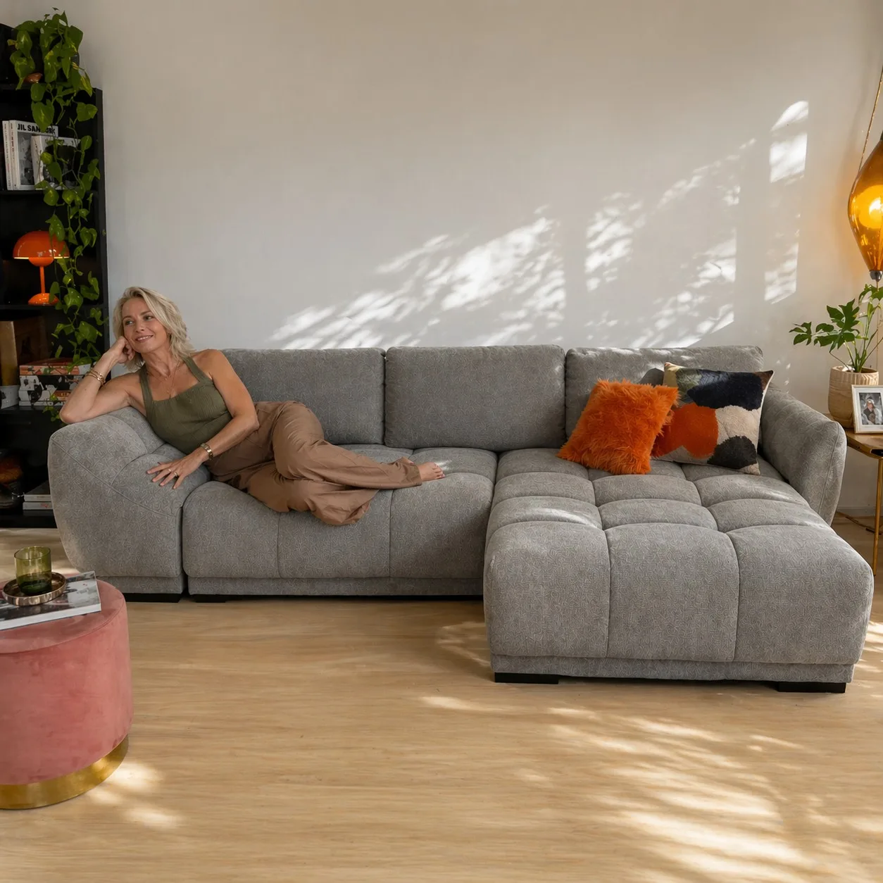 A CUUBY sarokkanapé puha tapintású, szürke zsákszövettel készül, amely enyhén vízlepergető hatású és tartós használatra tervezett.