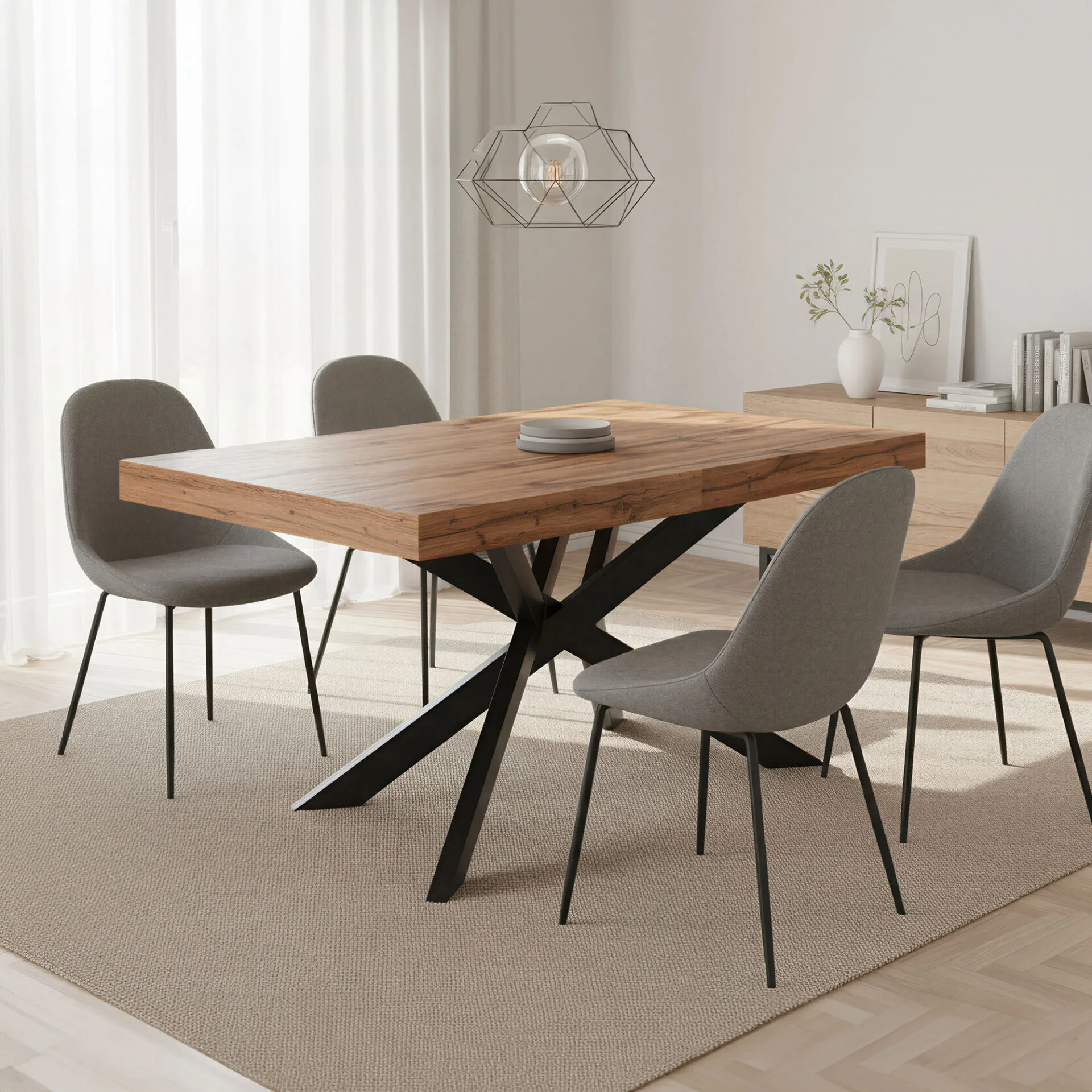 A masszív fémváz gondoskodik arról, hogy a bővített állapotban is billegésmentes, stabil asztalt kapjunk. A letisztult, geometrikus lábkialakítás vizuális könnyedséget ad a bútornak, miközben erőt és karaktert sugároz, így a modern enteriőrök elegáns kiegészítője lehet.