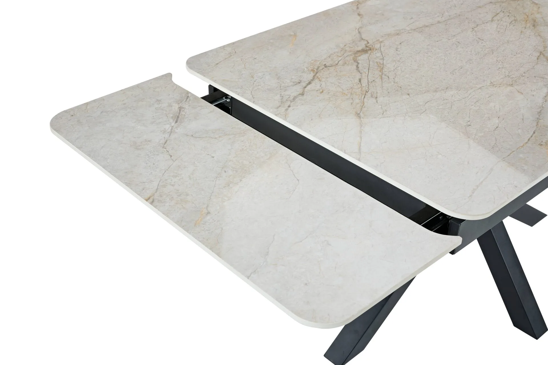 A letisztult, modern lábkialakítás karaktert ad a bútornak, miközben vizuálisan könnyed, elegáns megjelenést biztosít. A fekete fém kontrasztja kiemeli a szinterezett kő lap luxus jellegét, így az asztal bármely modern enteriőr központi eleme lehet.